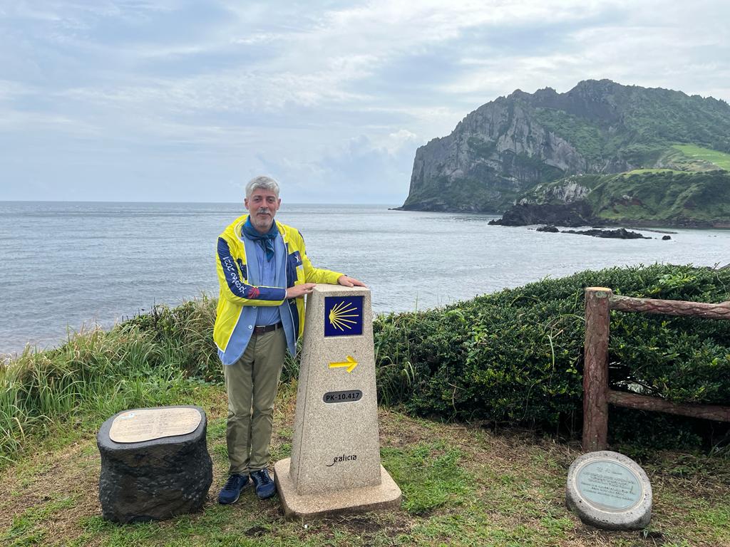 La isla de Jeju, Patrimonio Mundial de la UNESCO y principal destino vacacional para los coreanos, mantiene estrechos vínculos con el Camino de Santiago, ya que fue la Ruta Jacobea la que inspiró su creación. Como Caminos de la Amistad que son ambos itinerarios llevan en contacto desde 2016 estrechando alianzas que ahora culminan con este mojón del Camino instalada de manera simbólica en este itinerario natural coreano.