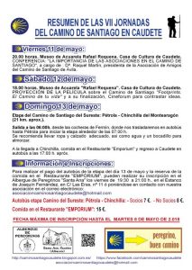 Las jornadas comenzarán el viernes día 11 de mayo, con la celebración de una interesante conferencia titulada: La importancia de las asociaciones en el Camino de Santiago, a cargo de Dª. Raquel Martín, presidenta de la Asociación de Amigos del Camino de Santiago de Ávila. Siguiendo el sábado día 12 con la proyección de la película sobre el Camino de Santiago Footsprints. El Camino de tu vida y posterior cineforum para contrastar ideas. Finalizando las jornadas el domingo día 13 con la realización de la etapa del Camino del Sureste entre Pétrola y Chinchilla del Montearagón.